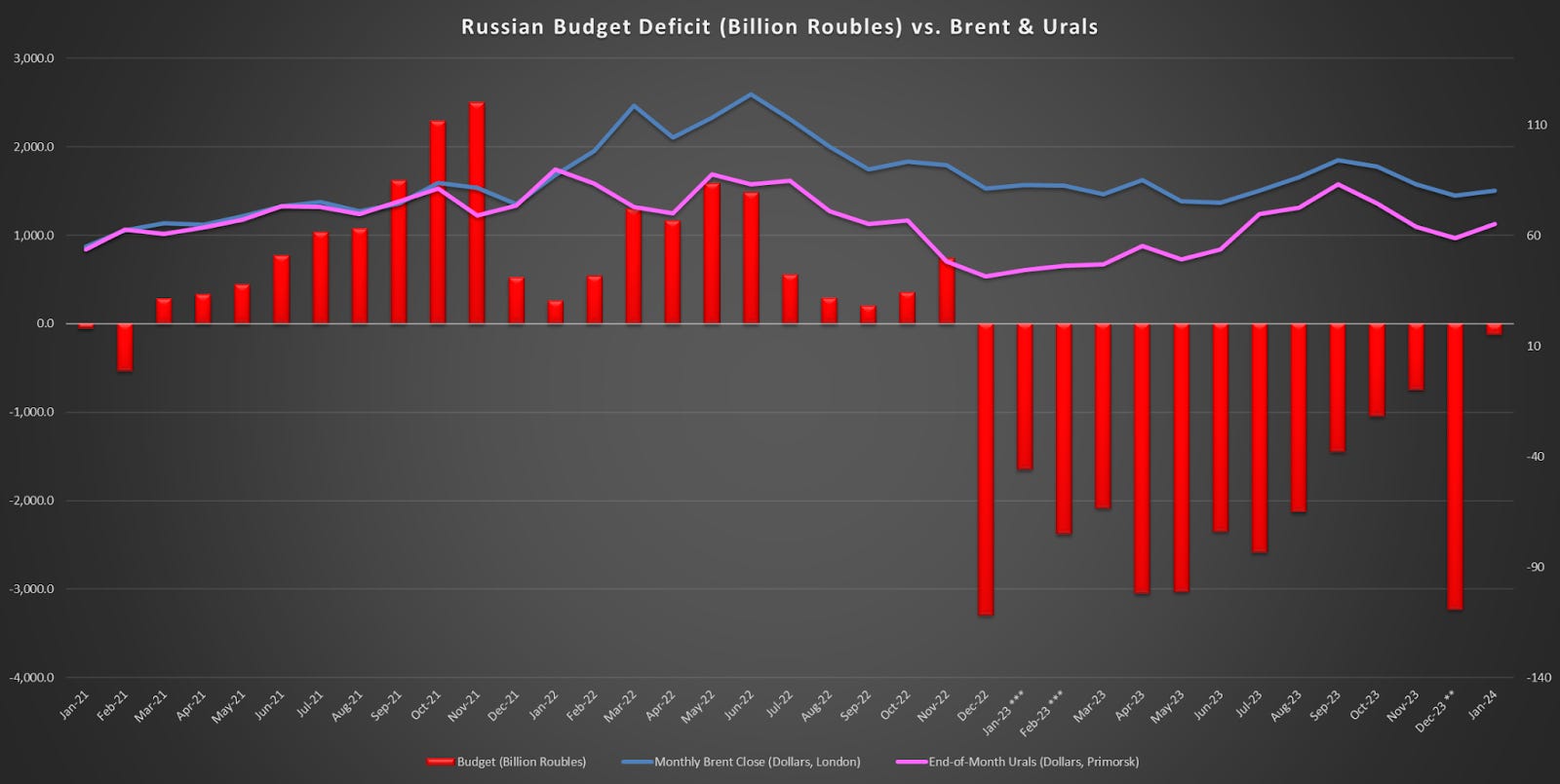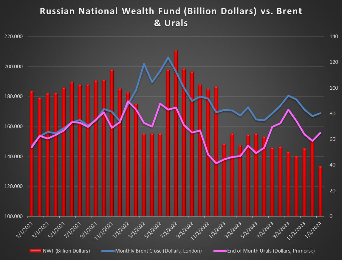 But the government has been quickly burning through these NWF reserves as it hemorrhages cash in Ukraine and ramps up its military-industrial base. In Roubles, Moscow’s liquid holdings slumped from 8.9 trillion before the war to 5 trillion at the end of 2023. The NWF, which is made up of roubles, foreign currencies, and gold among other assets, has been falling since the Brent/Urals gap started to widen in December 2022. But it hasn’t been able to catch up to the bump in Urals early this year — NWF levels typically track Urals prices, but since July 2023 the two data points have diverged. As of January 2024, the NWF was at its lowest point since April 2020: