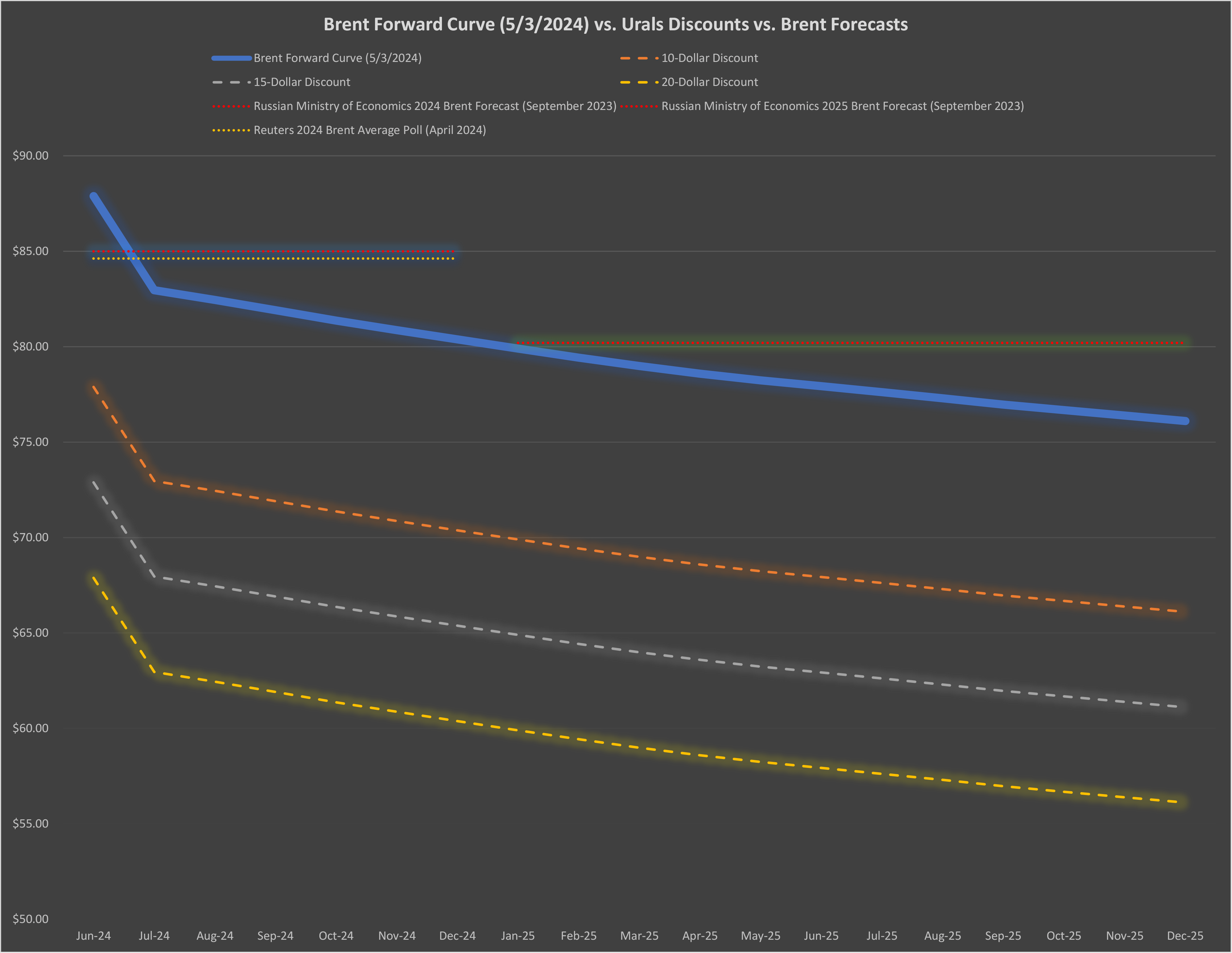 Russia’s budget is highly dependent on revenues from oil and gas — its Ministry of Finance uses a price-of-oil base case to guide fiscal policy. For 2024, the Russian budget follows an Urals $70-per-barrel assumption. Considering the forward curve (as of 5/3/2024) and 2024 average forecasts for Brent, and hypothetical Urals discounts (the real one has recently widened), it’s clear that Russia’s typically conservative budgeters were overambitious when assuming the export price for oil. If the Brent forward curve stays backward through the year, spot prices would exceed forecasts: