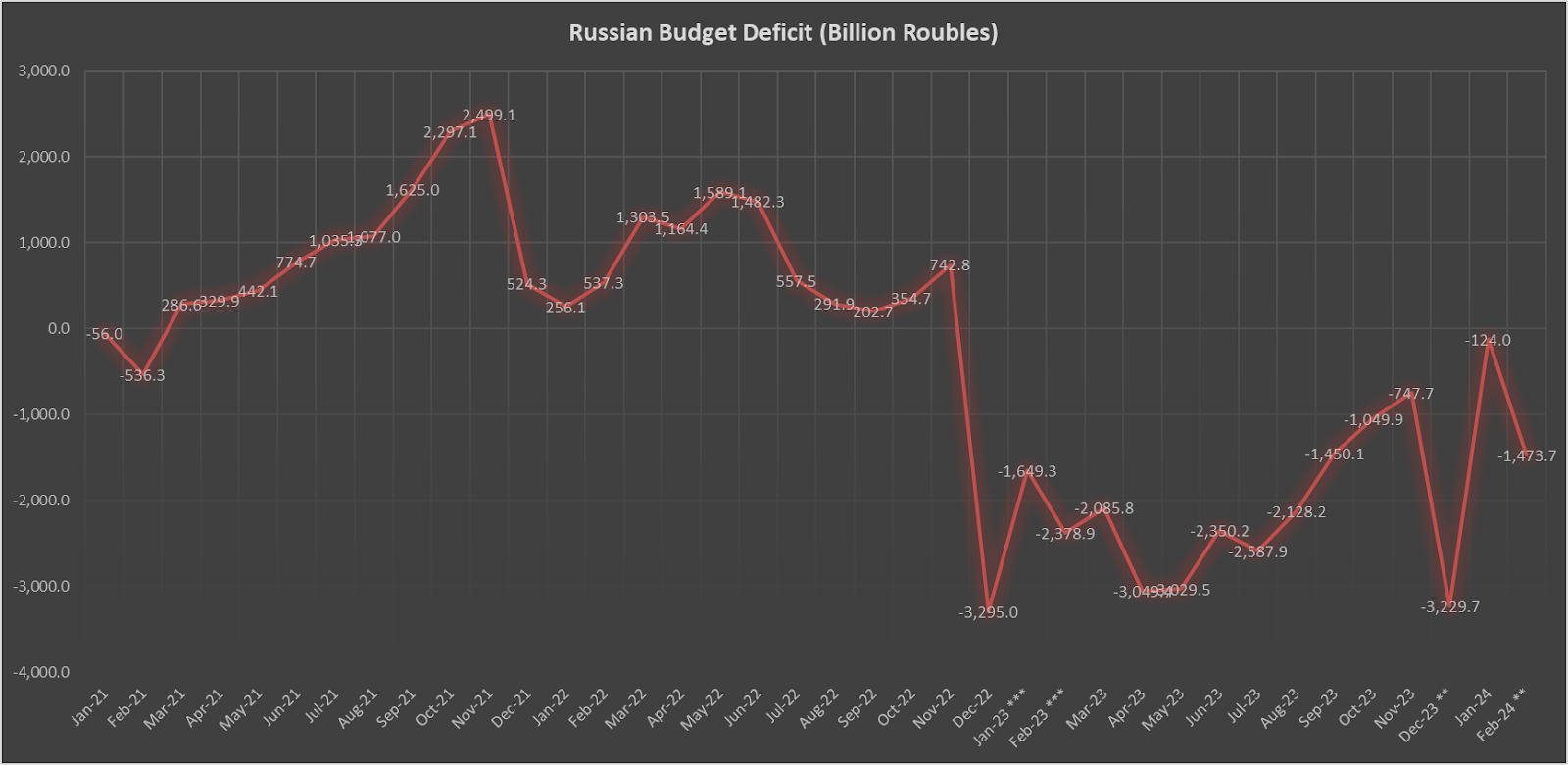 March’s data seems to reverse those downward trends. The Kremlin’s budget reentered surplus territory at 867 billion roubles. Overall budget revenues for Q1 2024 were up 53.5% compared to the same quarter last year.